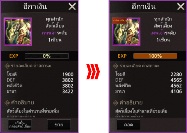 จะสามารถได้รับ EXP สัตว์เลี้ยงและค่าสถานะของสัตว์เลี้ยงจะเพิ่มขึ้นตามสัดส่วน